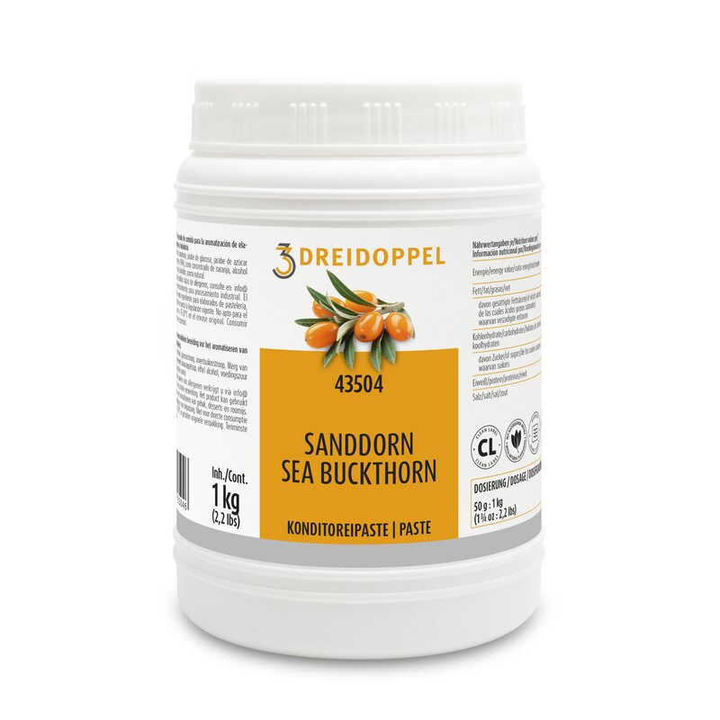Dreidoppel Compound Sanddorn 1 kg ist eine aromatisierte Paste, die für verschiedene Leckereien verwendet werden kann. Die Sanddornbeere ist vielleicht nicht jedem bekannt. Es handelt sich um eine orangefarbene Beere, die an der Küste wächst. Sie ist säuerlich und hat mit etwas Zucker einen herrlich frischen und überraschenden Geschmack.